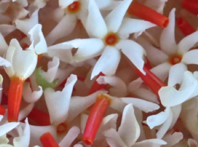The sweetly-scented white flowers of the night-blooming jasmine Nyctanthes arbor-tristis with their distinctive orange stems are used in a soothing tisane.